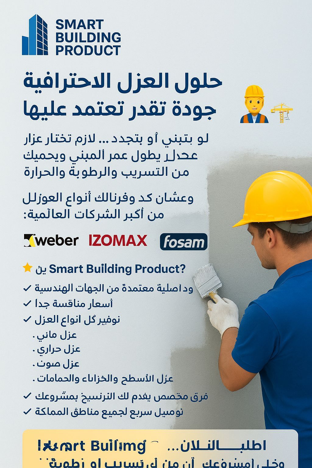 Smart Building Product حلول العزل الاحترافية جودة تقدر تعتمد عليها لو بتبني أو بتجدد لازم تختار عزل يطول عمر المبنى ويحميك من التسريب والرطوبة والحرارة. وعلى لشان كده وفرنا لك أفضل أنواع العوازل من أكبر الشركات العالمية Weber ويبر Izomax إيزوماكس Fosam فوسام عوزال الخليج ليه تختار العزل من Smart Building Product مواد أصلية معتمدة من الجهات الهندسية أسعار منافسة أطلب الآن