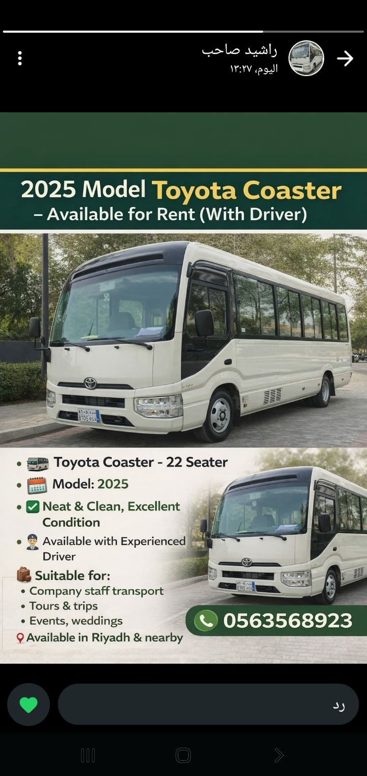 تأجير باصات كوستر وهايس في جميع أنحاء السعودية نوفر باصات كوستر 24 و30 راكب وهايس 14 راكب مع سائقين محترفين. جميع السيارات موديل 2025، نظيفة ومكيفة ومناسبة للسياحة في الرياض. أسعارنا مناسبة وخدمتنا مضمونة وآمنة. واتساب أو اتصال