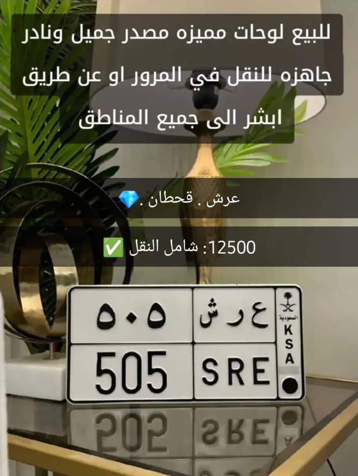 لوحة سيارة ع ر ش 505 للبيع ب 12500 شامل النقل