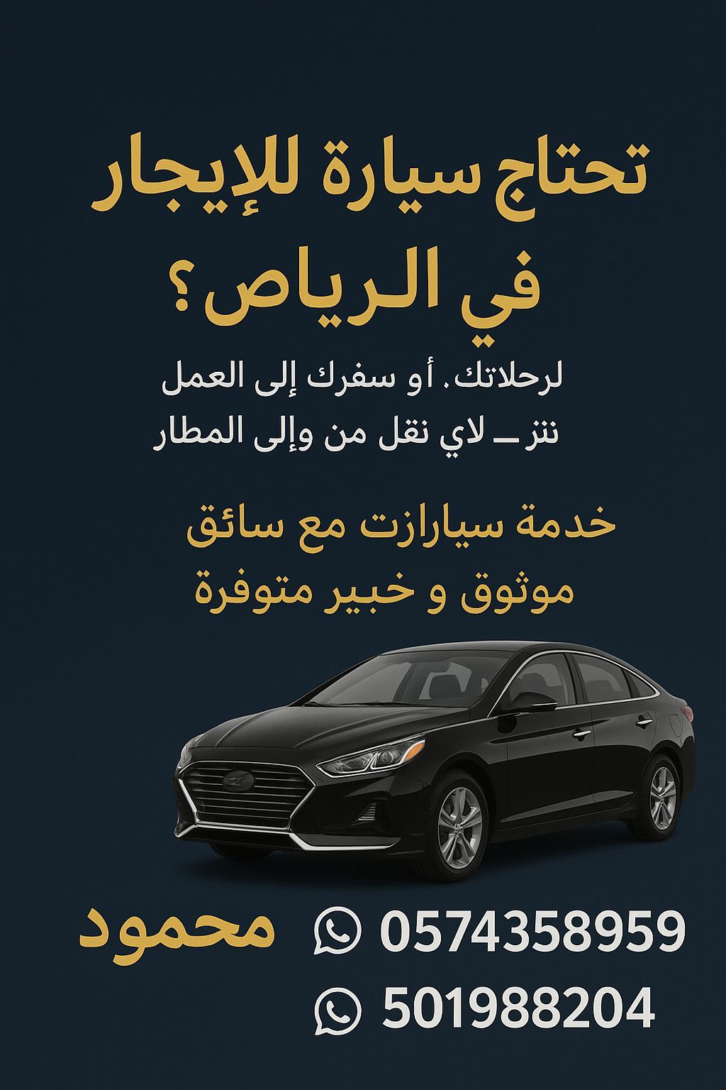 تحتاج سيارة للإيجار في الرياض لرحلاتك. أو سفرك الى العمل نتر - لأي نقل من والى المطار خدمة سيارات مع سائق موثوق وخبير متوفرة محمود