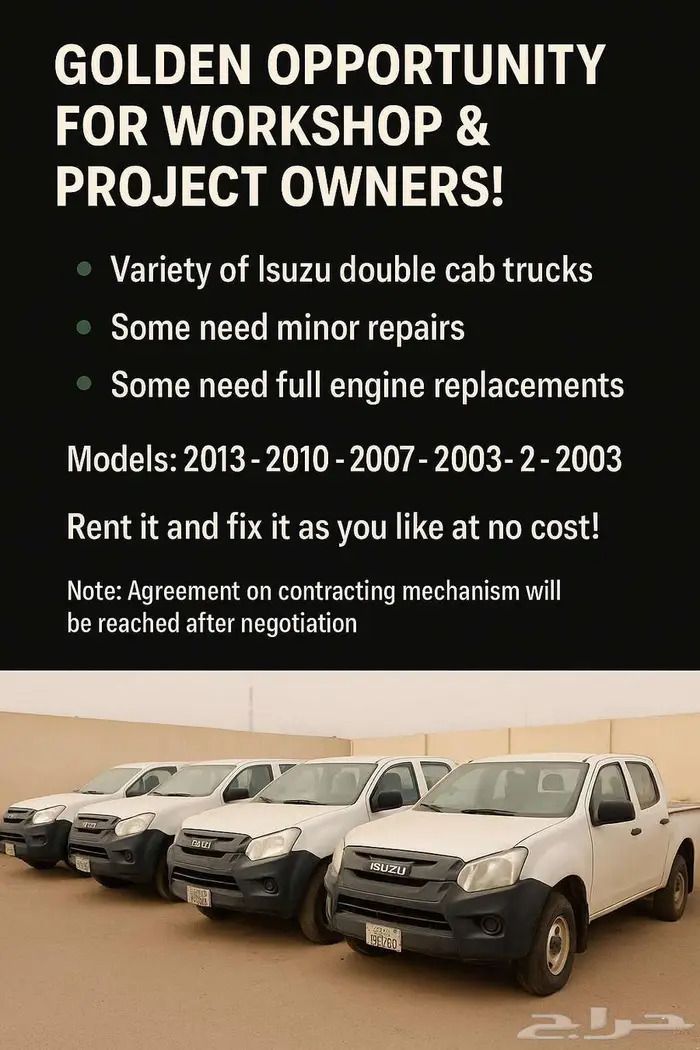 Isuzu Crew Cab rent & Repair Deal Available Isuzu Pickups (Diesel/ Manual) 2003 - 2019. Mileage from 159000 km. The Deal Open for all business types. Cover the repair costs (minor/ major) and expenses will be credited toward the rental period and fees. Great for all commercial projects. Riyadh