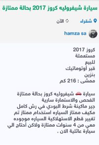 Chevrolet Cruze in excellent condition, 2017 model. Inspection valid, registration valid. Engine and transmission in good condition. Air conditioning excellent. Full body repaint, minor scratches. The car is generally excellent for daily use. I travel to Mecca and Medina, and thank God it's excellent.