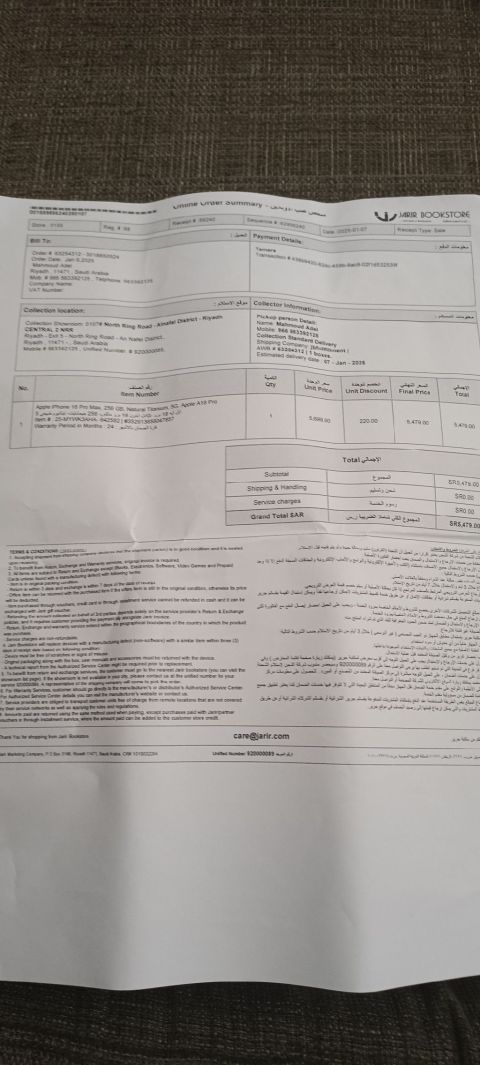 آيفون 16 برو ماكس 256 جيجا. ضمان جرير بطارية 99. لا يوجد أي خدوش تماما استعمال بسيط جدا وسبب البيع وجود تلفون من الشركة. الرياض. حي اليرموك. السعر 4000 قابل للتفاوض البسيط للجاد. للتواصل