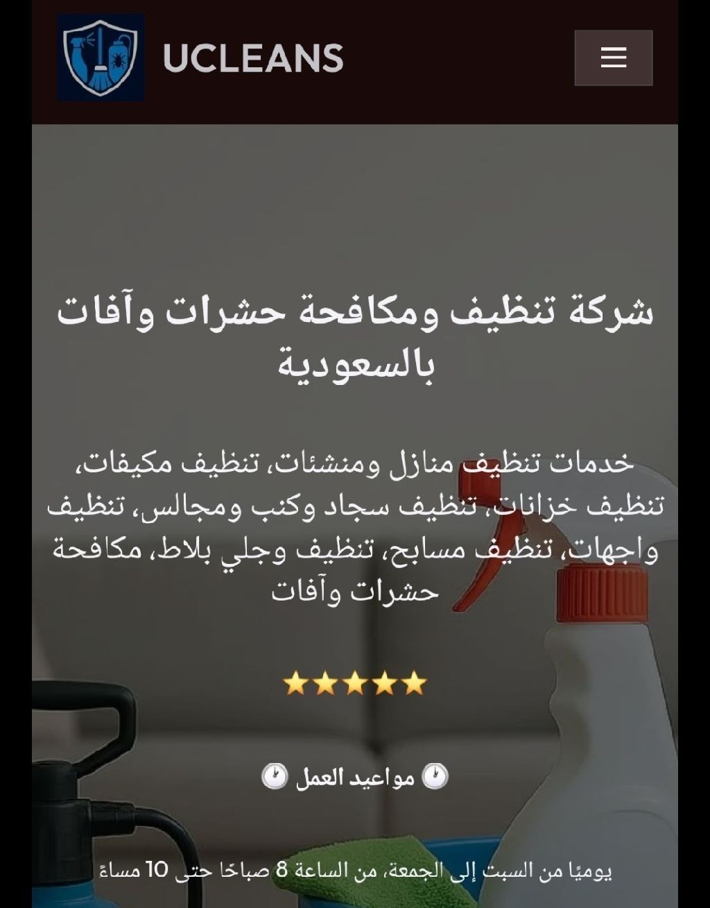 خدمات تنظيف منازل ومنشئات، تنظيف مكيفات، تنظيف خزانات، تنظيف سجاد وكنب ومجالس، تنظيف واجهات، تنظيف مسابح، تنظيف وجلي بلاط، مكافحة حشرات وآفات