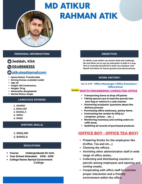 I am Looking for a job - Office Boy, Office Tea Boy, Office Coffee Boy, Office Assistant, Office Cleaner, I have an experience more than 6 years in Saudi Arabia - I have valid Driving license. Iqama Transferable - Age 25 - Education Undergraduate - Height 180 cm - Weight 75 - Spoke Language Arabic, English, Bangla, Hindi and Urdu - Writing Skills English and Bangla and (Arabic little)