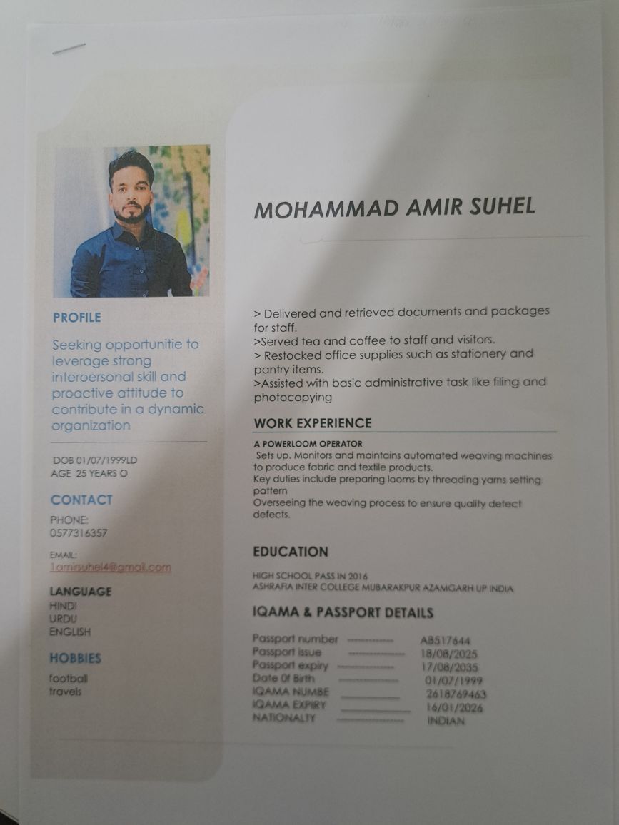 Looking for job in Riyadh Saudi Arabia. Iqama transferable. helper. office boy. factory helper. cartooner packing. messenger. document controller. language known urdh hindi engligh Arabic