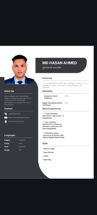 I am Hasan Ahmed from Bangladesh. I am searching a job and I know speaking English, Hindi and basic Arabic language The kind of work I want Restaurant cleaner, Waiter, Residential Hotel cleaner, Hospital cleaner, Office cleaner & Tea boy. My lqama has expired 1 month, you can contact me (WhatsApp and call)