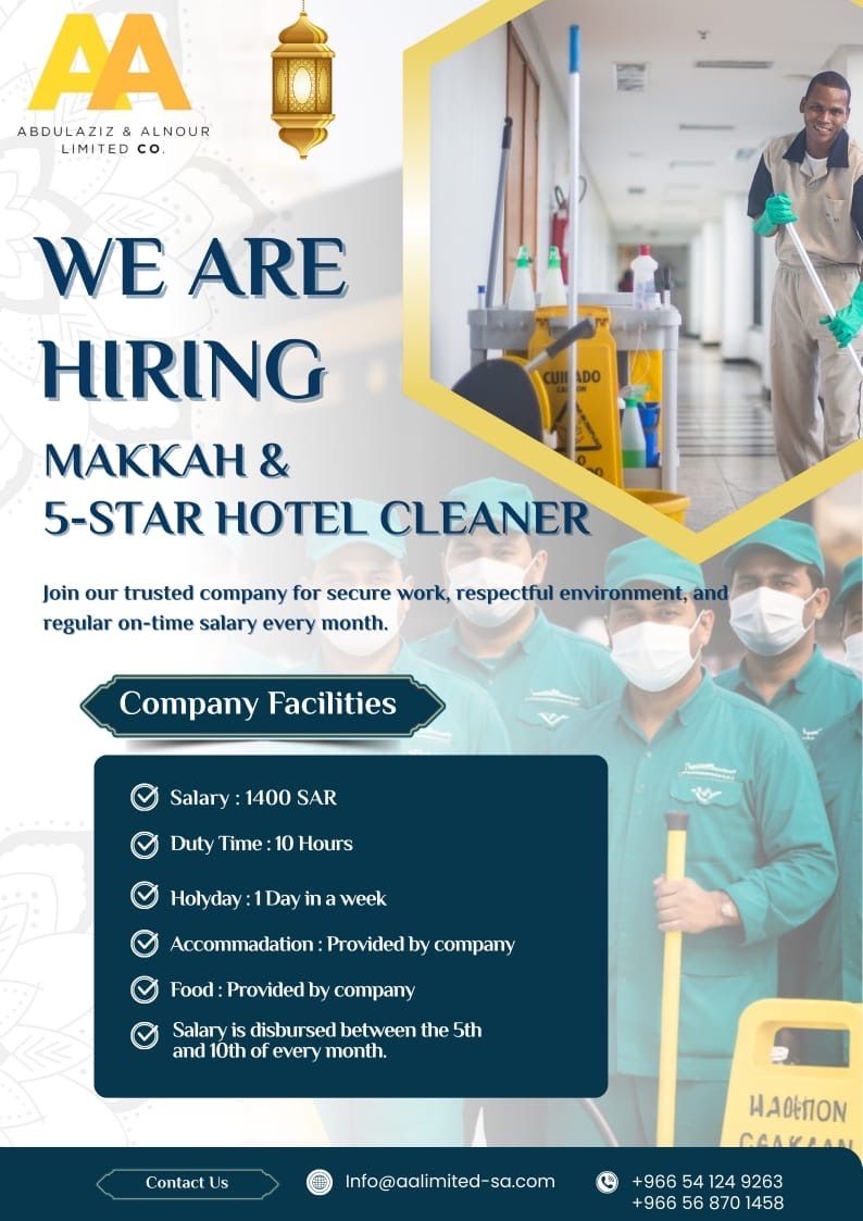 We are hiring Cleaners and Mecca cleaner Across around Mecca city Aziziya Al Numas St. Selary 1400 Riyal