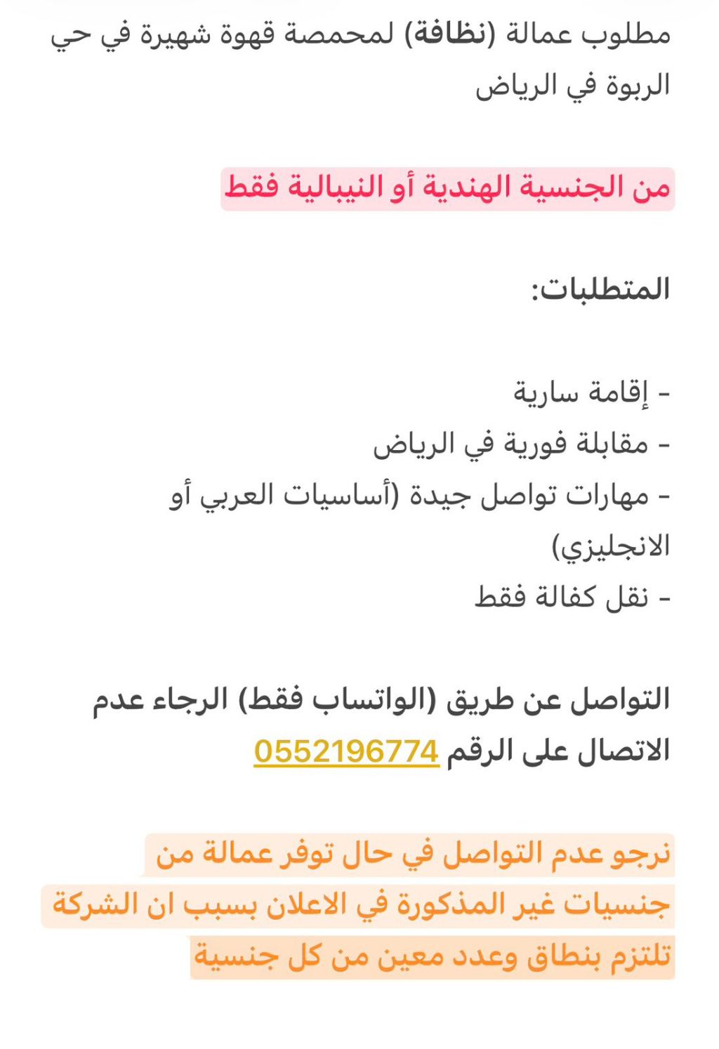 مطلوب عمالة (نظافة) لمحمصة قهوة شهيرة في حي الربوة في الرياض من الجنسية الهندية أو النيبالية فقط المتطلبات إقامة سارية - مقابلة فورية في الرياض - مهارات تواصل جيدة (أساسيات العربي أو الانجليزي) نقل كفالة فقط التواصل عن طريق (الواتساب فقط) الرجاء عدم الاتصال على الرقم نرجو عدم التواصل في حال توفر عمالة من جنسيات غير المذكورة في الاعلان بسبب أن الشركة تلتزم بنطاق وعدد معين من كل جنسية