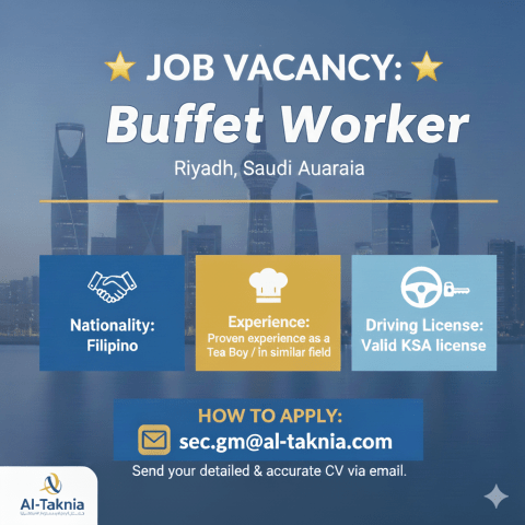 Required Filipino Tea Boy (Experienced/ Residing in KSA) for our office in Al Nakheel District, Prince Abdelaziz Street, Riyadh Saudi Arabia. with a Driving License please Send your CV to