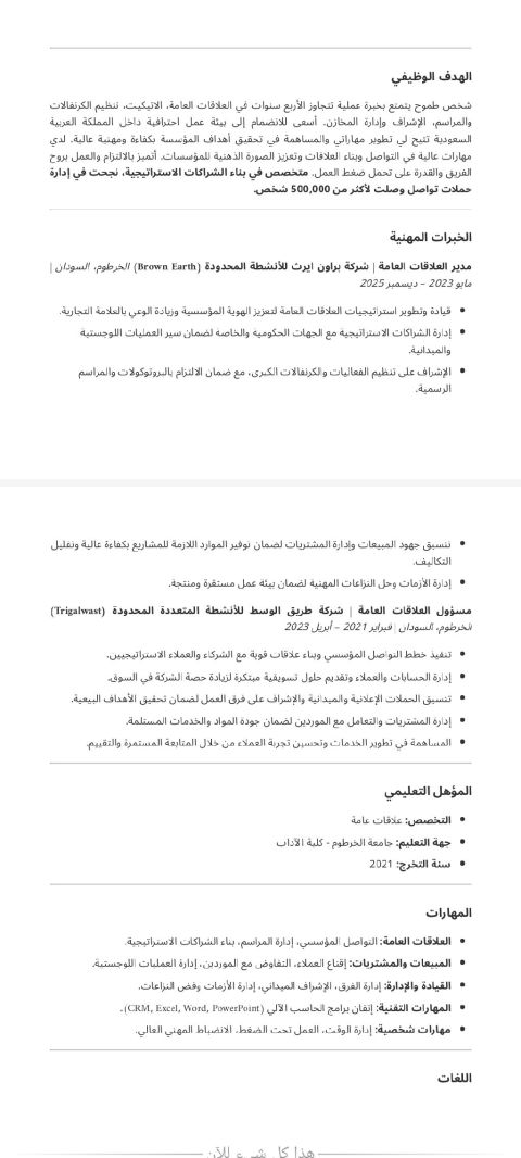 Sudanese national with over 4 years of experience in public relations and administrative operations. I possess strong skills in corporate communication, organizing events and exhibitions, and persuasive sales and marketing. I have experience using all Microsoft Office programs, Saudi government apps, customer service, and accounting systems. I am seeking a position as an Events and Exhibitions