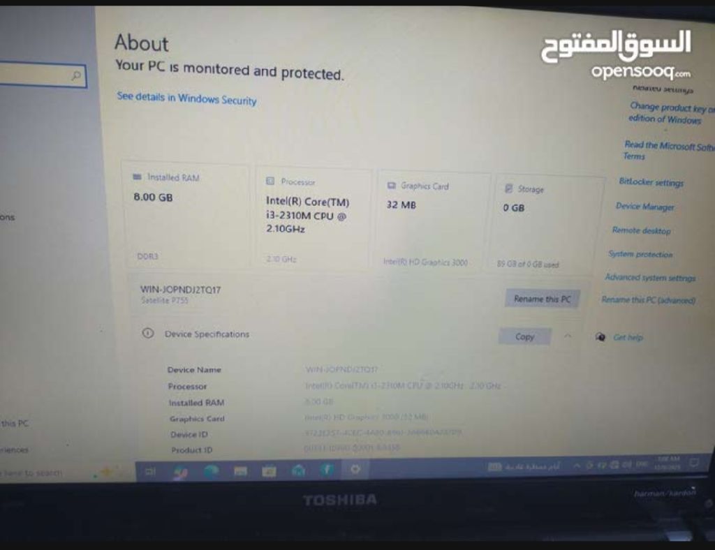 لابتوب بحالة جيد جدا النوع Toshiba الرام 8 Core i3 windows 10 pro يدعم الواي فاية Hard 466