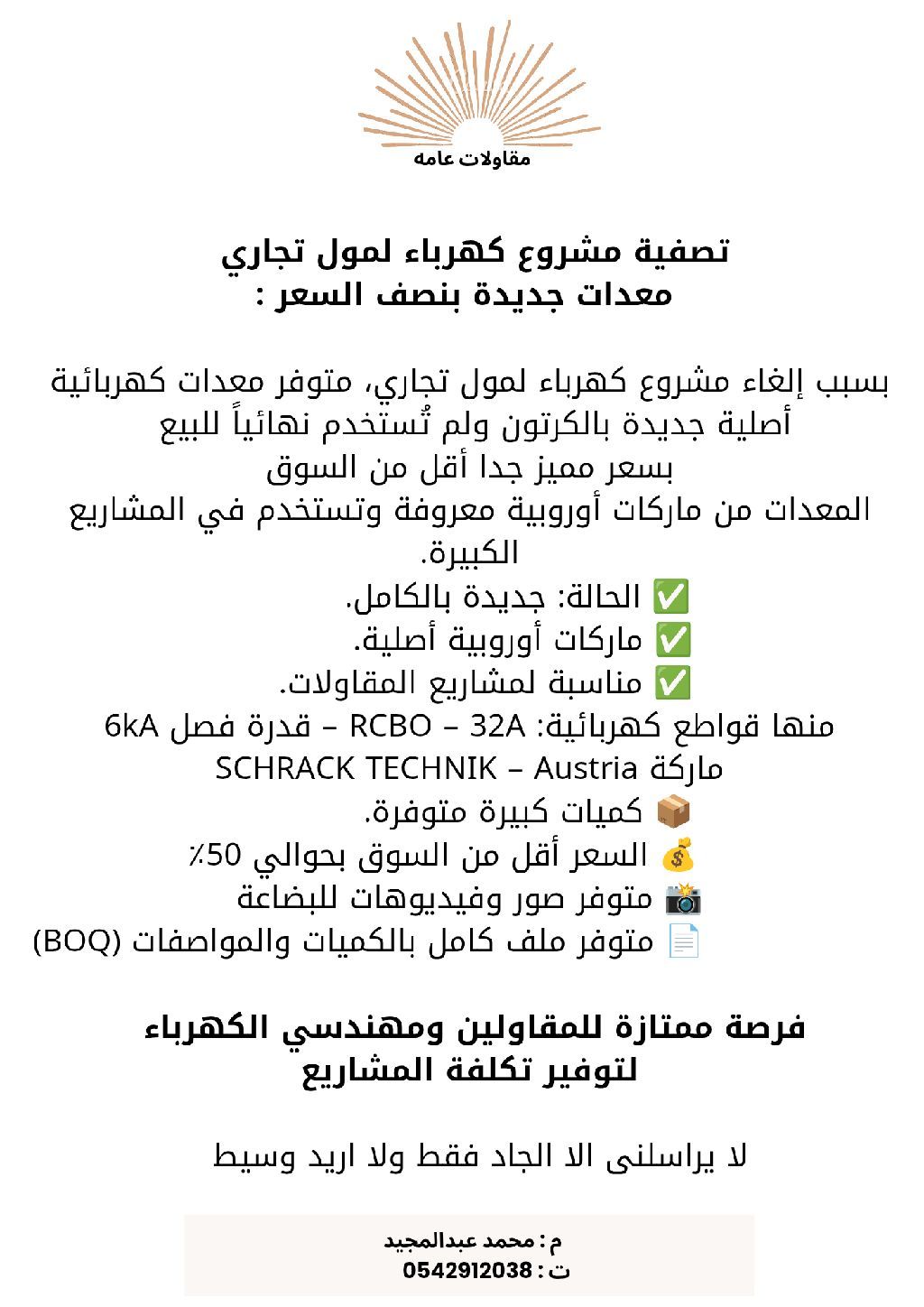 متوفر لدينا مخزون كامل من معدات كهربائية جديدة كانت متوردة لمشروع مول تجاري وتم الغاء المشروع. من السوق المعدات من ماركات أوروبية مثل Schrack Technik وجميعها جديدة بالكرتون. متوفر صور وفيديوهات وكذلك ملف كامل بالكميات والمواصفات (BOQ) لو حابين التفاصيل أو الملف أرسله لكم