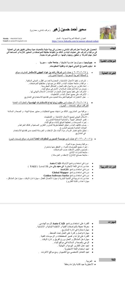 مشرف موقع ذو خبرة تزيد عن 13 عاما في المملكة العربية السعودية، متخصص في مشاريع البنية التحتية والطرق. يمتلك خلفية قوية كفني مختبر مدني مع خبرة في اختبارات الاسفلت والخرسانة وضبط الجودة. ماهر في الاشراف على مصانع كسارات الاسفلت، مع ضمان السلامة والانتاجية والالتزام بالمعايير. يتمتع بمهارات قيادية قوية والعمل الجماعي وحل المشكلات. يسعى للحصول على فرصة عمل لتقديم خبراته والمساهمة في نجاح المشاريع