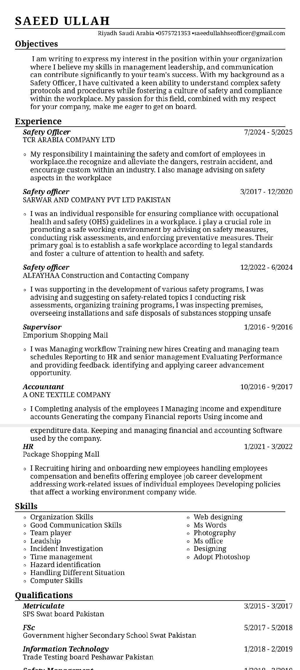 I would like to introduce myself I believe on my skills, Qualifications and experience that is necessary for an organization I am safety officer, I had done safety management and safety related certificates like Nebosh Certified by a rich experience of 5 years as a safety officer in different projects across different locations at Saudi Arabia Riyadh