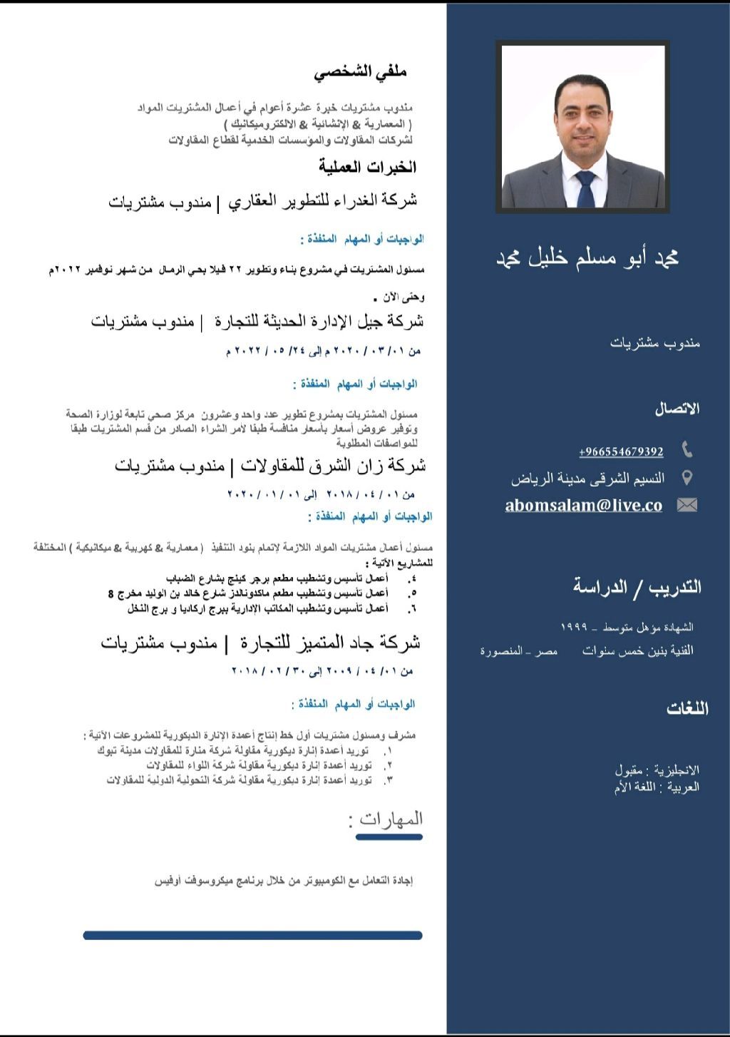 مندوب مشتريات متخصص في قطاع المقاولات والتطوير العقاري، اعمل على إدارة عمليات الشراء والتوريد بكفاءة عالية لضمان توفير المواد والمستلزمات وفق أعلى معايير الجودة وبأفضل الأسعار. امتلك خبرة في التفاوض، مقارنة العروض، اختيار الموردين الموثوقين، ومتابعة تنفيذ طلبات الشراء حتى وصول المواد لمواقع العمل في الوقت المحدد. يبحث عن عمل
