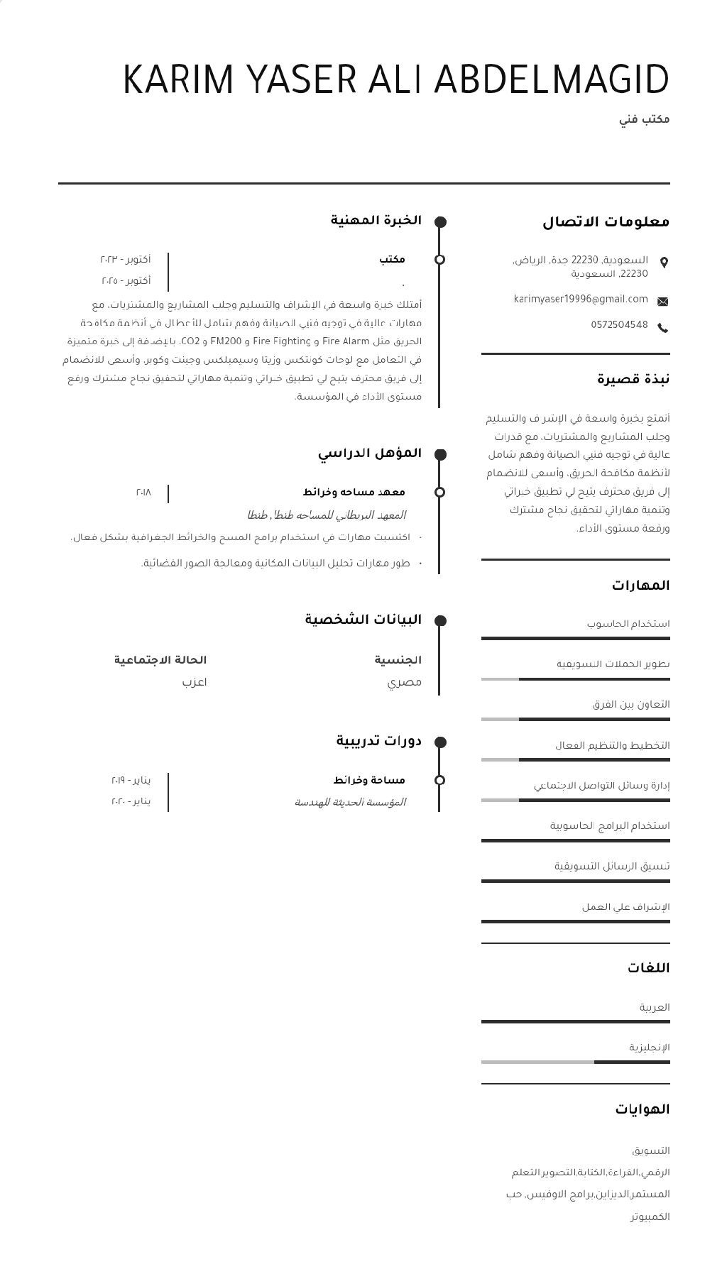 أنا اشتغلت في شركة مقاولات أنظمة سلامه كاملة وعندي خبرة في مجال التسويق والديزاين وخبرة جيد جدا في استخدام الحاسوب واشتغلت علي الاوتوكاد حصر كميات وعلي علم بجميع القطع المعتمده والبدائل ليها المشتريات كاملة. أنا كان تخصصي حصر كميات من اوتوكاد وتطبيق المخطط علي الواقع والاشراف والتسليم وجلب المشاريع والمشتريات وكنت اوجة فنيين الصيانة وعلم بكافة الأعطال الموجودة في الأنظمة مثل Fire Alarm وFire Figh