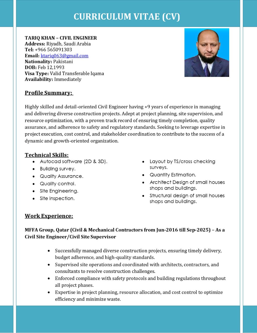 Dear HR Managers, I am a graduate civil engineer looking for Civil site engineer/ QC civil engineer job. I have transferable visa/ Iqama and 9 years GCC experience of high rise building construction. My current location is Riyadh KSA and I am ready to work anywhere in Saudi Arabia. Please find the attached CV. Thanks