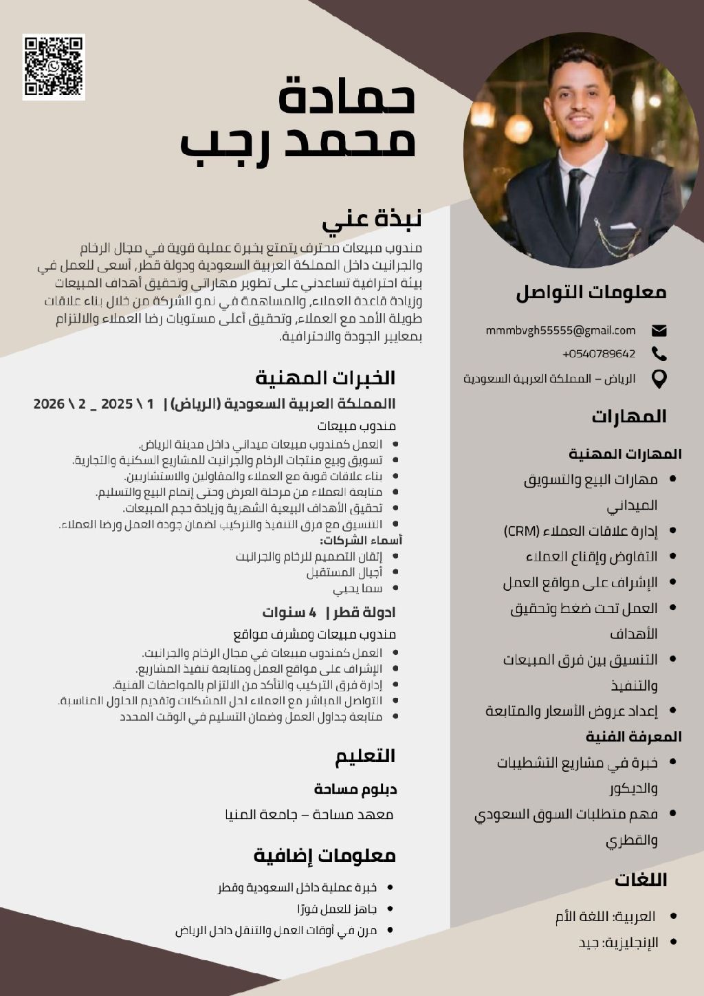 مندوب مبيعات سابقة في الرياض في عدة شركات طريق الخرج في مجال الرخام والجرانيت توريد وتركيب أو توريد فقط ومشرف مواقع وعندي خبرة كبيرة داخل الرياض وسابقة اشتغلت في دوبة قطر كمندوب أيضا ومشرف مواقع في مجال الرخام والجرانيت ومعي داتا كويسة