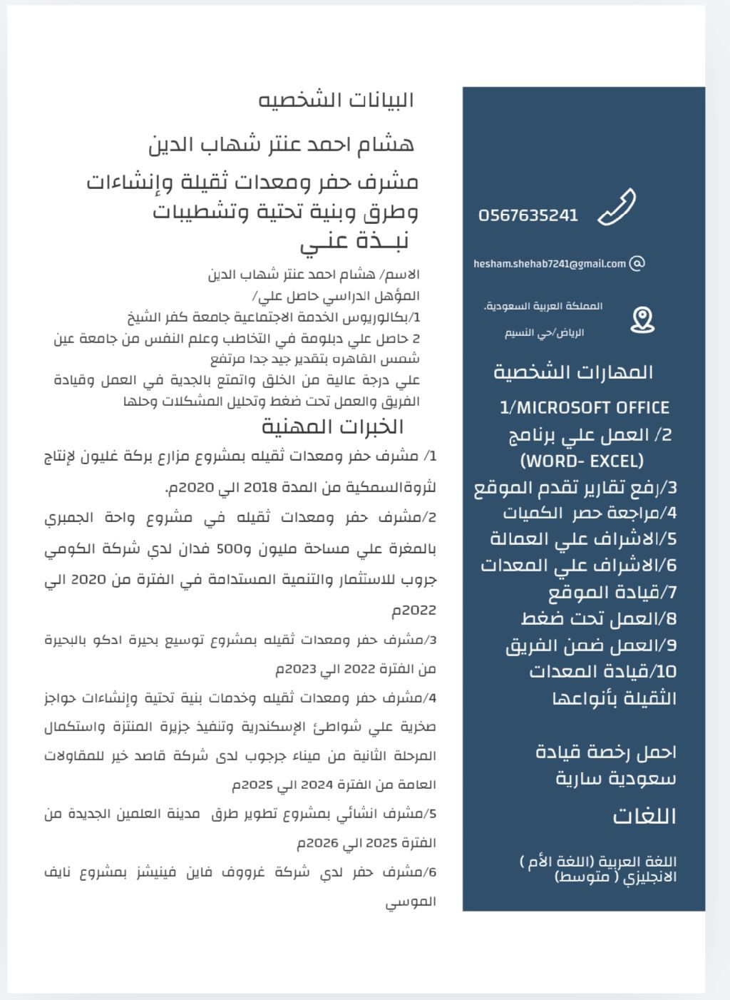 أنا هشام شهاب الدين مصري الجنسية 29 سنة ابحث عن عمل في مجال المقاولات خبرة 8 سنين في مجال الاشراف على المعدات الثقيلة بأنواعها والاشراف علي العمالة والمواقع الانشائية والتشطيبات والطرق والبنية التحتية وقيادة كافة المعدات الثقيلة معي إقامة سنة ورخصة قيادة سارية مقيم في الرياض