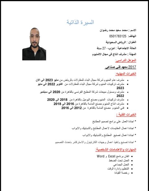 أنا مشرف انتاج وتركيبات في مجال الألومينيوم وملم جدا بالمجال وخبرة أكثر من 10 سنوات و3 سنوات داخل السعودية’ ابحث عن فرصة عمل مناسبة
