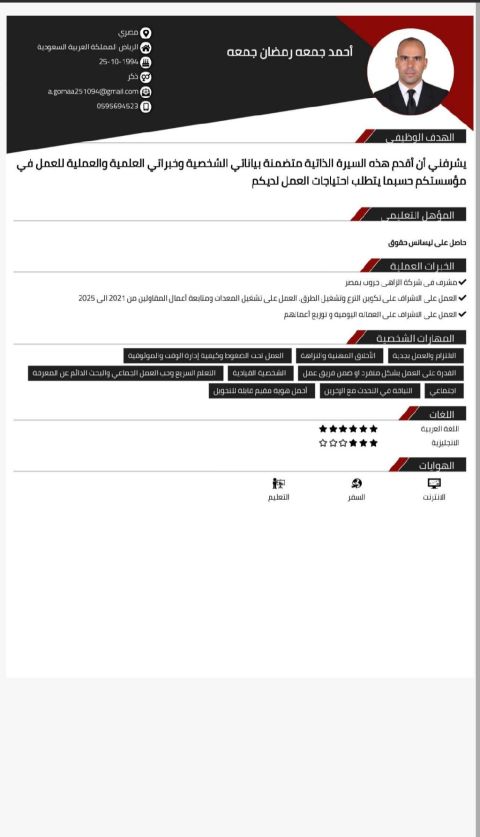 مراقب عام لدى خبرة 5 سنوات في مجال المقاولات والانشاءات وتنفيذ المشروعات الضخمه من بداية الحفر الى التسليم النهائي على دراية كاملة بي أعمال الحصر وقراءة المخططات وتفريد الحديد واستلام النجارة والحدادة وتسليمها الى الاستشاري. على دراية كاملة بي استلام جميع بنود التشطيبات وتسليمها الى الاستشاري. القدرة على توزيع العمالة ومتابعة كافة الأعمال واليوميات