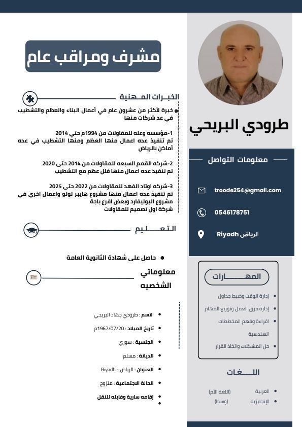 مراقب ومشرف عام خبرة أكثر من 20 عام في أعمال البناء والتشطيب