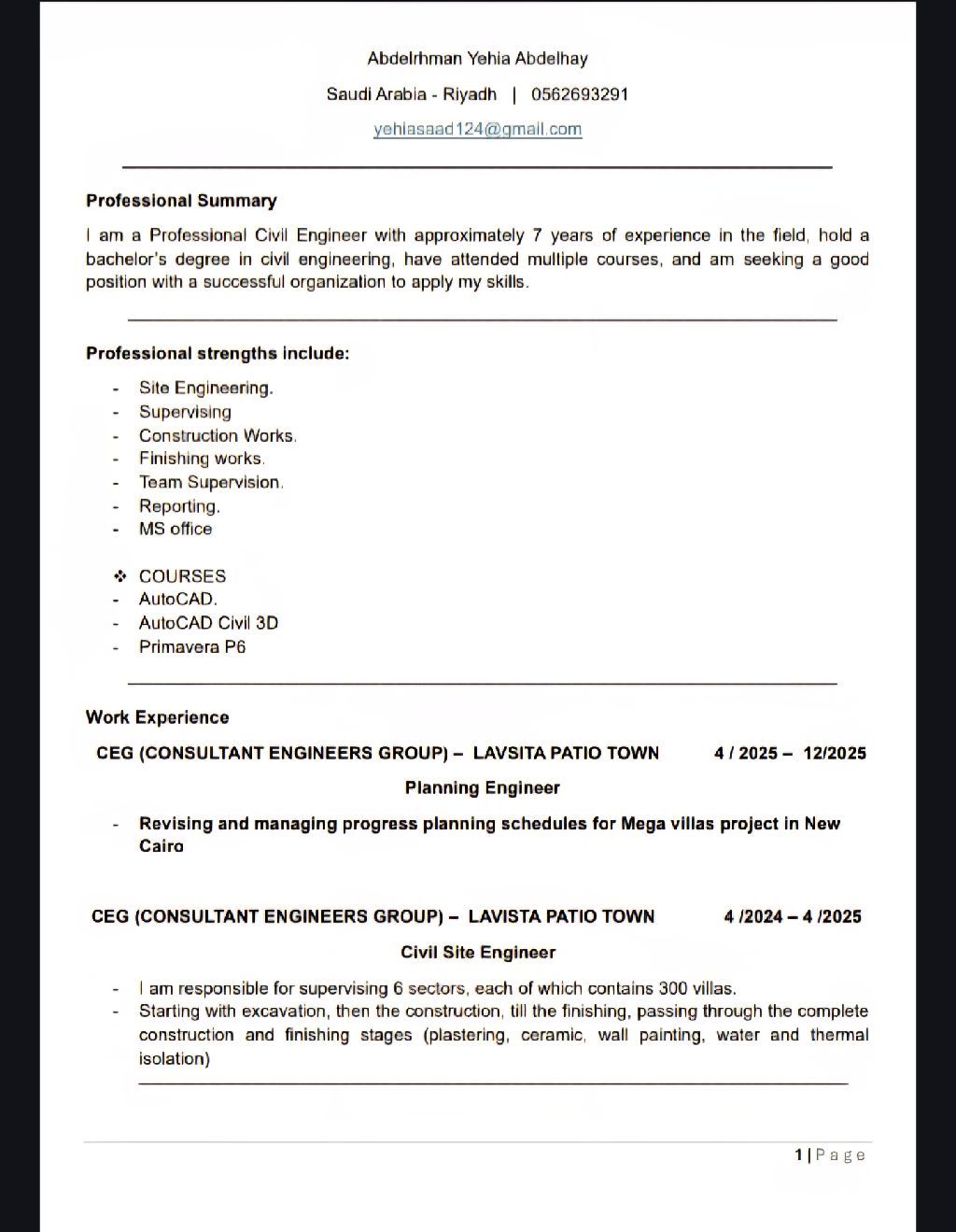 I am a site Civil engineer with 7 years experience in construction and finishing and planning I've worked in mega villas and buildings projects as a contractor and as a consultant in egypt kindly contact me to send you my CV and I have transfarable Iqama