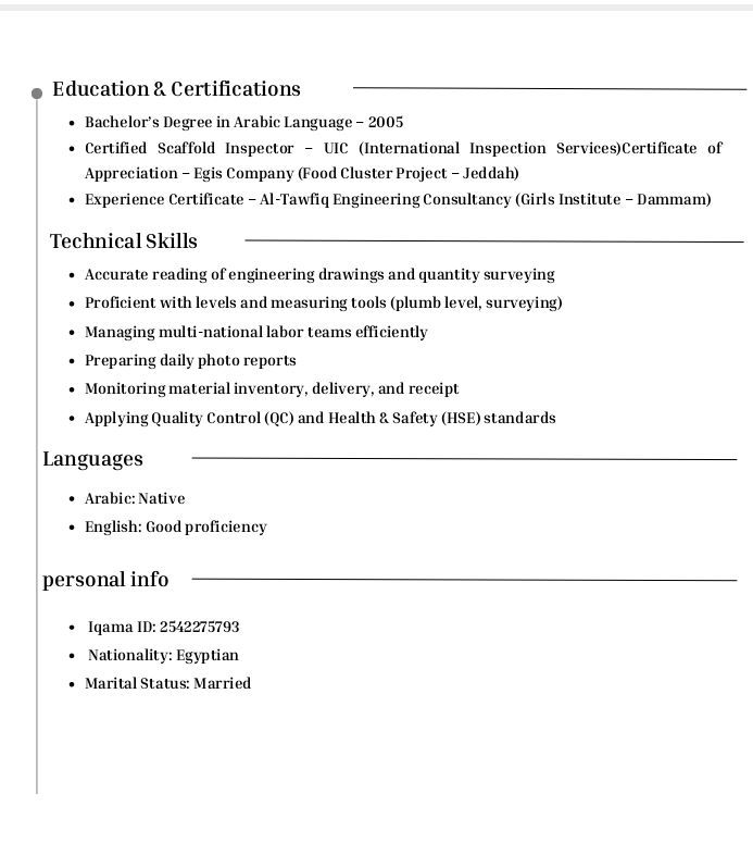 مشرف مباني عام خبرة كبيرة بالمشاريع الحكومية والخاصة بوزارة الدفاع السعودية والمؤسسة التقنية والمنافذ الحدودية والمطارات السعودية ومشاريع المناطق الصناعية في مدن والمشاريع الخاصة قصر الدرعية وبرج تاريم في الرياض ومنتجع الهاتف مون الخبر امتلك خبرة كبيرة بإدارة الأعمال المدنية والمعمارية والموقع العام القدرة التامة للعمل تحت ضغط العمل وتنفيذ المخططات بدقة متناهية وتلافي الأخطاء إدارة العمالة باحتراف