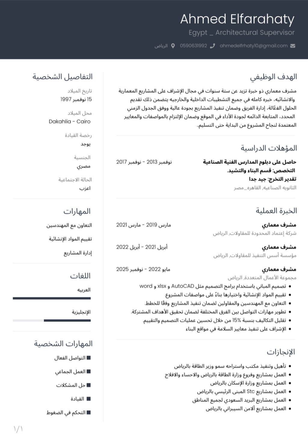 مشرف معماري طموح، خبرة أكثر من 6 سنوات بالمملكة تضمن مشاريع سكنية ومشاريع حكوميه كبيرة