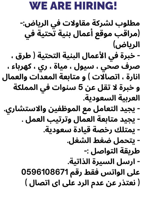 مطلوب لشركة مقاولات في الرياض مراقب موقع أعمال بنية تحتية في الرياض) خبرة في الأعمال البنية التحتية (طرق، صرف صحي، سيول، مياه، ري، كهرباء، انارة، اتصالات) ومتابعة المعدات والعمال وخبرة لا تقل عن 5 سنوات في المملكة العربية السعودية. يجيد التعامل مع الموظفين والاستشاري. يجيد متابعة العمال وترتيب العمل. يمتلك رخصة قيادة سعودية. يتحمل ضغط الشغل. العليا طريقة التواصل أرسل السيرة الذاتية