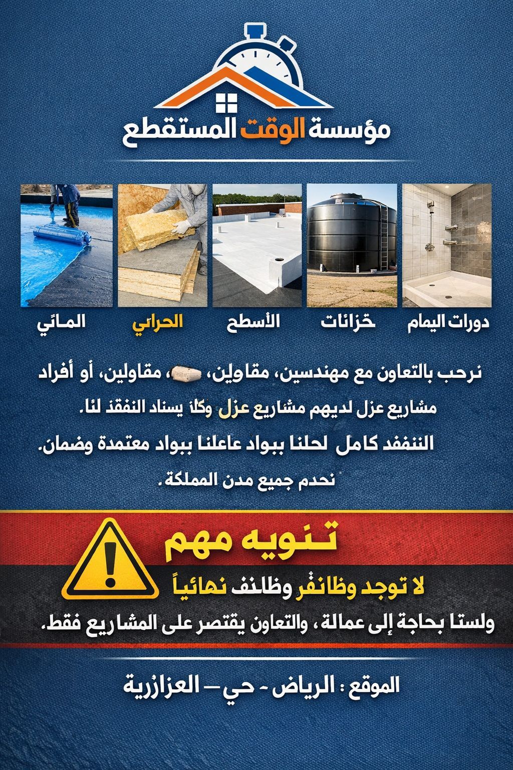 مطلوب مهندسين للتعاون مع "مؤسسة الوقت المستقطع" لجلب مشاريع عزل مقابل نسبة مالية مجزية وفورية ننفذ باحترافية تامة كافة الأنواع عزل مائي وحراري، عزل فوم (بولي يوريثان) عزل إيبوكسي للأرضيات، عزل اسمنتي، وعزل مسابح وخزانات. الجودة عالية "تبيض الوجه" والضمان والمسؤولية علينا بالكامل. مقرنا الرياض - حي المنفوحة، ونخدم جميع مدن المملكة. تواصل معنا الآن لبدء شراكة مربحة