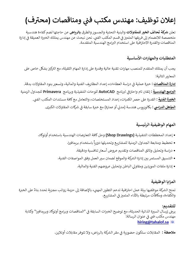 تعلن شركتنا عن حاجتها الى موظف مكتب فني مناقصات (محترف) بخبرة في الطرق والبنية التحتية للانضمام لفريق العمل. يرجى إرسال السيرة الذاتية الى البريد الألكتروني مع كتابة مهندس - مكتب فني في عنوان الرسالة لا يوجد مقابلات اونلاين - المقابلات فقط من مقر الشركة في الرياض - حي السلمانية