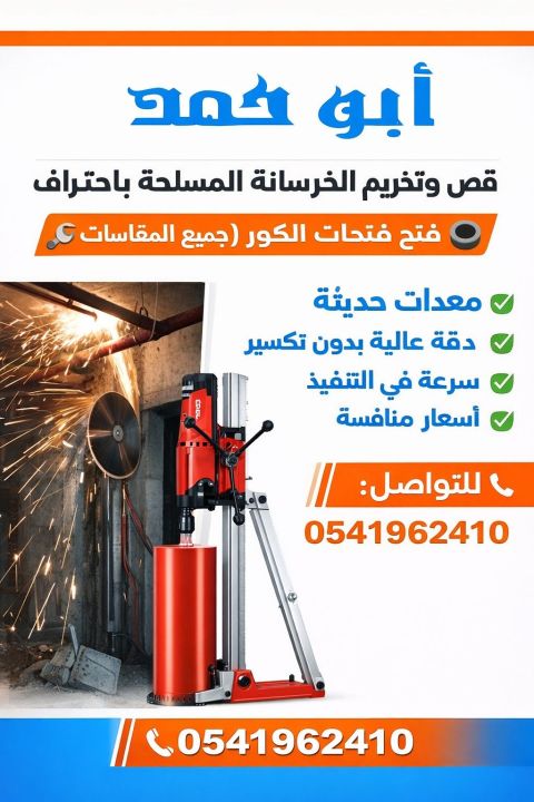 نعمل في مجال التخريم الكور وقس الخرسانة شغل نظيف معدات جاهزة متواجد في الرياض أبو أحمد