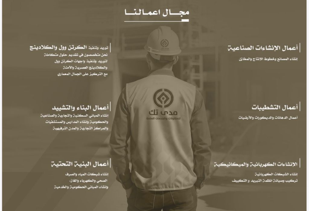 مؤسسة مدى تك للمقاولات نقدم جميع أعمال المقاولات العامة باحترافية وجودة عالية، وتشمل أعمال البناء والتشييد أعمال الحفر والردم الترميم والصيانة التشطيبات الداخلية والخارجية أعمال الخرسانة المسلحة الديكورات والتشطيبات النهائية أعمال العزل بكافة أنواعه للتواصل والاستفسار جوال / واتساب مؤسسة مدى تك للمقاولات خبرة - جودة - التزام في التنفيذ
