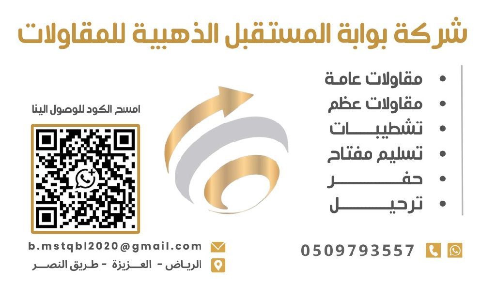 بوابة المستقبل الذهبية للمقاولات العامة الرياض خدماتنا (بناء عظم + تشطيبات + تسليم مفتاح حفر وترحيل معدات حديثة) لدينا عمالة مدربة ومعدات حديثة وأسعار مناسبة