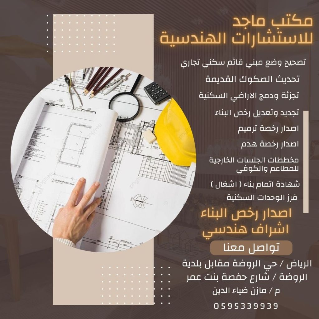 مكتب ماجد للاستشارات الهندسية أسعارنا تحت متناول الأيدي خدماتنا - رخص بناء جديدة سكني تجاري - تصحيح وضع مبني قائم سكني تجاري - تعديل مكونات رخصة البناء - نقل ملكية رخصة البناء - رخصة تسوير وملاحق - رخصة هدم - رخصة ترميم - تقارير مساحية - تحديث الصكوك - تجزئة ودمج الأراضي السكنية - مخططات الجلسات الخارجية للمطاعم والكوفي والمحلات - اعداد مخططات لوحات الدعاية والاعلان. فرز وحدات سكنية موقعنا الرياض