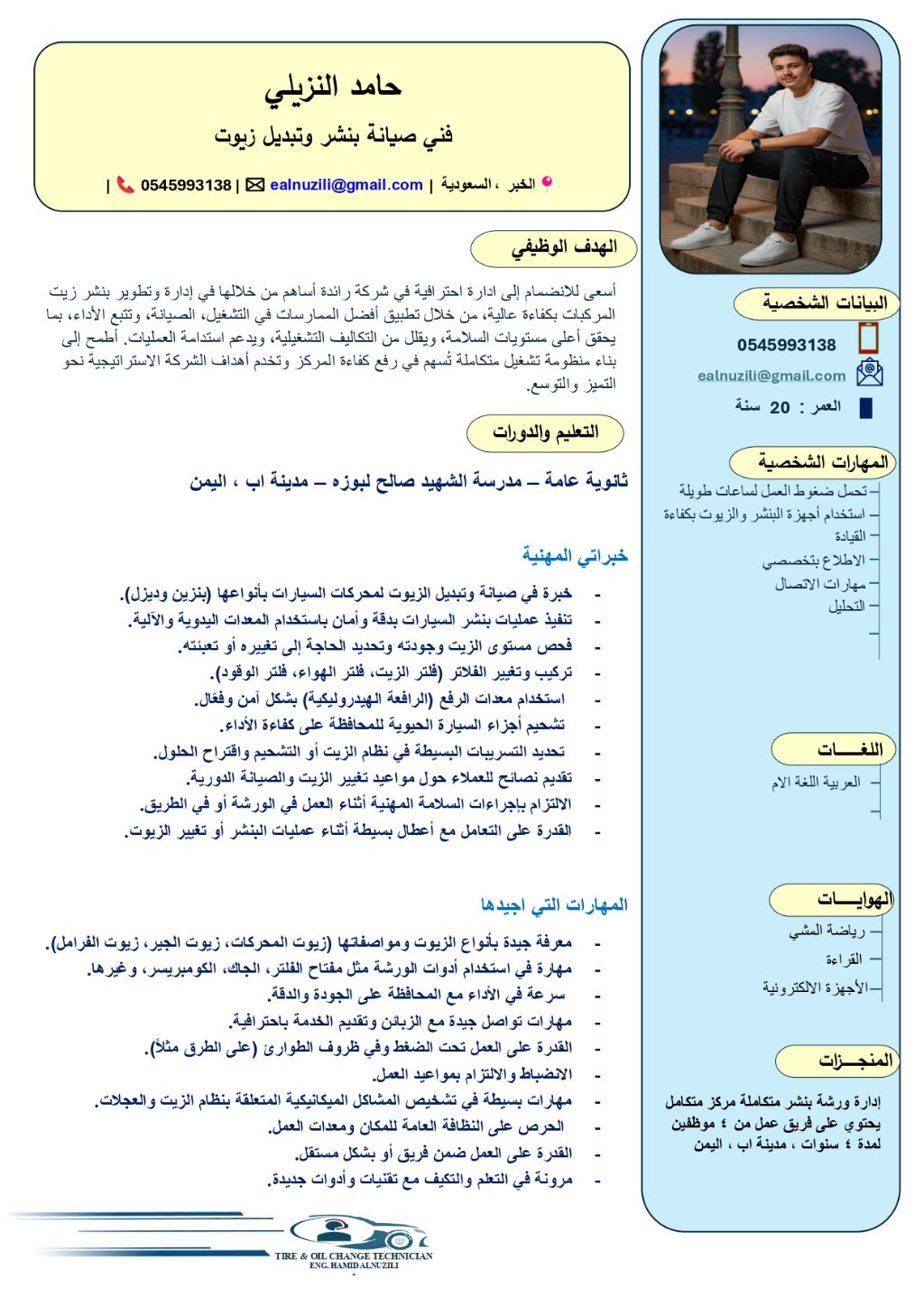 Tire and Oil Change Technician Looking for a Job I am a technician specialized in tire services (banchar "and oil and filter changes, with over 4 years of hands - on experience in this field. I am skilled in working with various types of vehicles, committed to accuracy, speed, and high - quality service. Engine oil change (all types) Air and oil filter replacement Tire services (replacement and installation)