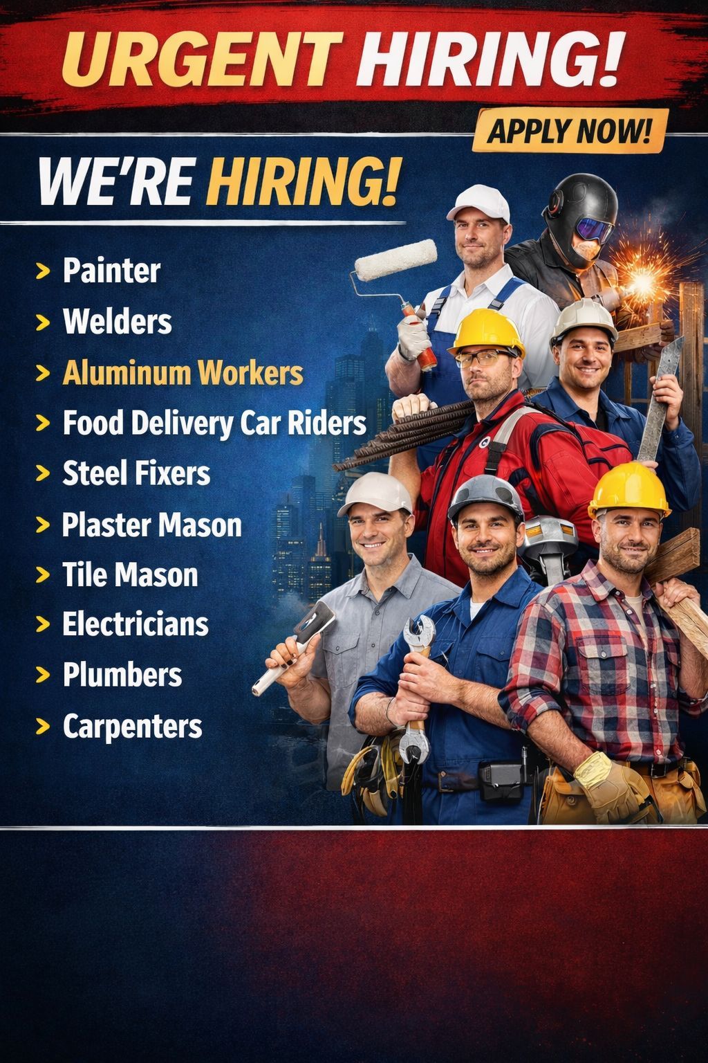 URGENT HIRING We are hiring skilled workers for immediate placement Painter, Welders, Aluminum Workers, Food Delivery Car Riders, Steel Fixers, Plaster Mason, Tile Mason, Electricians, Plumbers, Carpenters. Any kind of candidates are welcome. Ready for immediate joining. Apply now Fursan district Riyadh
