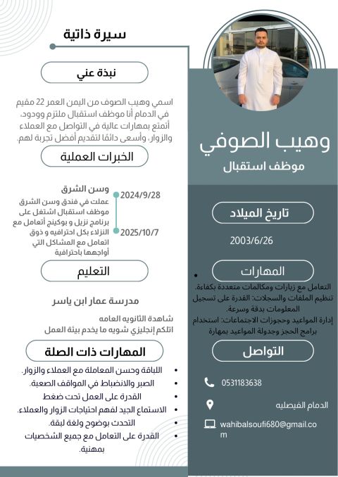 باحث عن وظيفة موظف استقبال فندقي السلام عليكم، أنا باحث عن فرصة عمل بوظيفة موظف استقبال في فندق في مدينة الرياض. لدي فترة تدريب في قسم الاستقبال في فندق واكتسبت خلالها خبرة في استقبال النزلاء وتسجيل الدخول والخروج والتعامل مع الحجوزات خدمة العملاء والرد على الاستفسارات العمل على أنظمة الاستقبال الفندقية أتميز بحسن التعامل مع الضيوف، اللباقة في التواصل، والقدرة على العمل بنظام الشفت