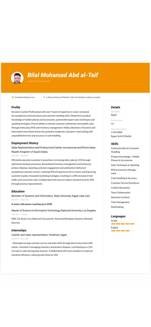 أنا اسمي أب وبكر حسن. سوداني الجنسية ابحث عن عمل كاشير ومشرف فرع عندي خبرة 6 سنوات في مجال الكاشير والاشراف وخدمة العملاء