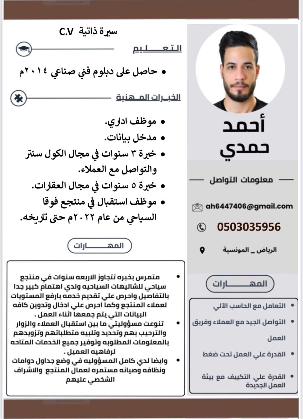 ابحث عن عمل أنا أحمد مصري الجنسية متواجد في الرياض عمري 29 سنة خبرة بمجال الكول سنتر 3 سنوات وموظف استقبال خبرة 5 سنوات ومشرف عمال ابحث عن عمل ومتفرغ للدوام