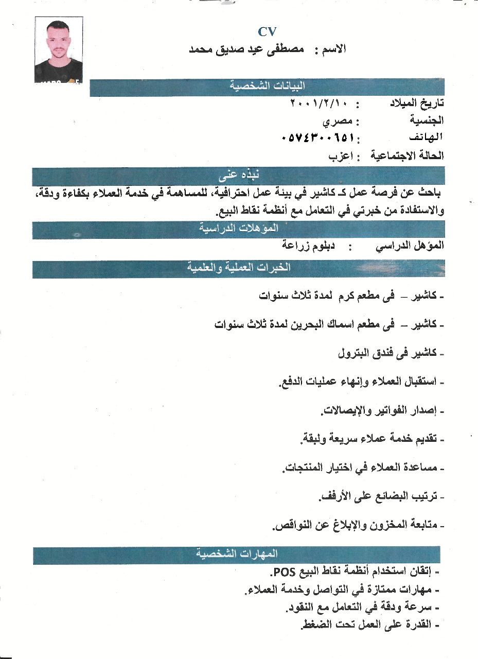 موظف كاشير وخدمة تقطيم الطعام، خبرة 4 سنوات له الخبرة التامة في التعامل مع الزبائن وتقفيل الحسابات اليوميه وايتر استقبال زبائن وسر فيز وخدمة تقديم الطعام خبرة 2 سنوات إقامة قابلة للنقل الفوري