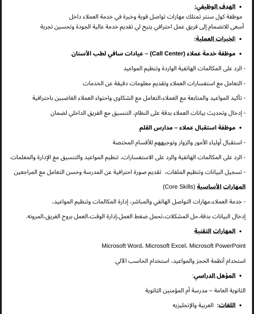 حاصله على ثانوية عامة مسار تدبي اشتغلت سنة كول سنتر بعيادة طب الأسنان الفرابي