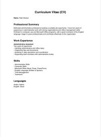 أنا شخص ابحث عن فرصة عمل مناسبة، لدي خبرة في مجال العمل الاداري لمدة سنتين، امتلك مهارات جيدة في تنظيم الأعمال والتعامل مع المهام المكتبية. أجيد استخدام الحاسب الآلي وبرامج مايكروسوفت أوفيس (Word، Excel، PowerPoint) كما أجيد اللغة الانجليزية تحدثا وكتابة. أسعى للعمل في بيئة مهنية تساعدني على تطوير مهاراتي واكتساب خبرات جديدة والمساهمة بشكل ايجابي في فريق العمل