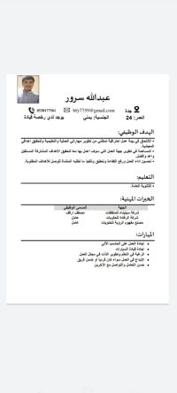 أنا عبدالله من حضرموت محترم ومنضبط في العمل ونشيط وأمين ساكن بمدينة الرياض وابحث عن عمل لدي رخصة قيادة أجيد استخدام الكمبيوتر المؤهل الدراسي ثانوي الخبرة اشتغلت ماشندايزر ومصفف لدي خبرة في ترتيب البضاعة وترتيب الجندولات واشتغلت مندوب مبيعات في مجال مواد البناء والكهربائية. رقم