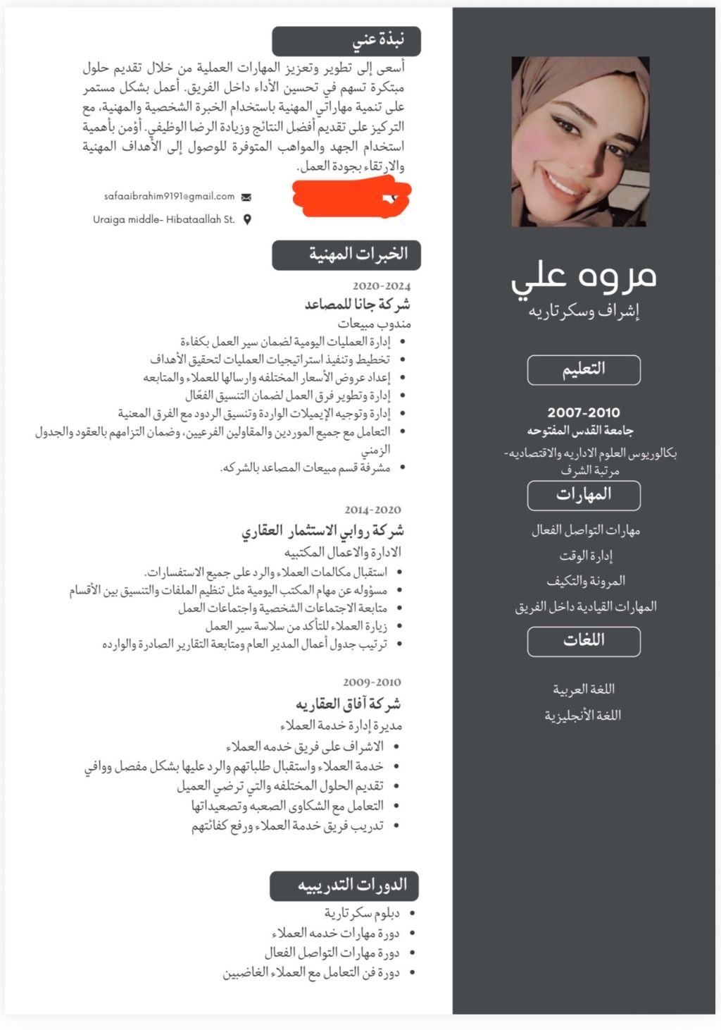أنا خريجة إدارة أعمال، ولدي خبرة عملية سابقة كمندوبة مبيعات ومديرة إدارة خدمة عملاء، حيث اكتسبت مهارات قوية في التواصل، وإدارة العلاقات مع العملاء، وتحقيق الأهداف البيعية، وتنظيم فرق العمل. أطمح للانضمام الى جهة عمل أستطيع من خلالها توظيف خبراتي ومهاراتي والمساهمة في تطوير بيئة العمل وتحقيق النجاح المشترك. الرجاء التواصل عبر
