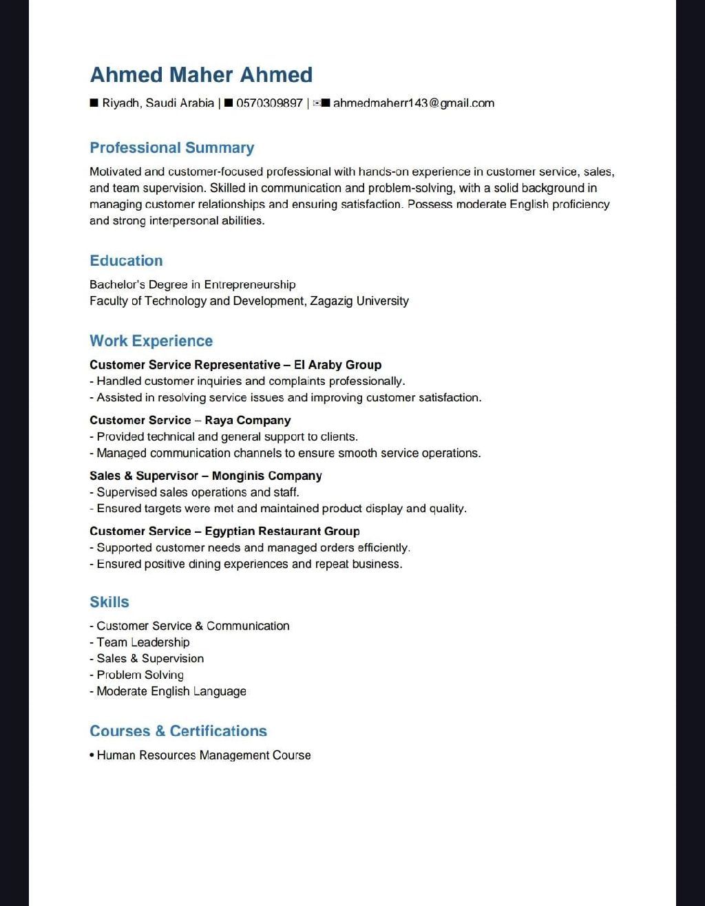 أحمد ماهر ابحث عن وظيفة استقبال أو كاشير بكلوريوس إدارة أعمال خبرة في مجال خدمة العملاء أكثر من ثلاث سنوات واشتغلت مشرف في مجال الحلويات والمطاعم لفترة طويلة