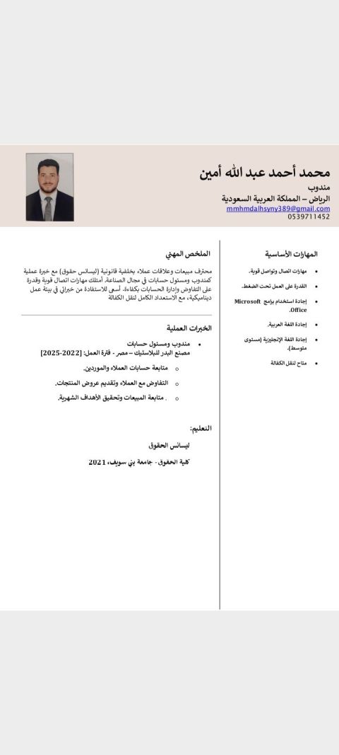 أرغب بالتقدم للعمل، حيث امتلك خبرة قوية في التسويق والتعاملات العامة خدمة العملاء الكاشير المبيعات التوصيل وأتميز بالجدية في العمل والالتزام، والقدرة على التكيف مع بيئة العمل وتحقيق الأهداف. جاهز للمقابلة في أي وقت الاسم مطهر عامر الجوال الايميل الموقع الرياض بانتظار ردكم