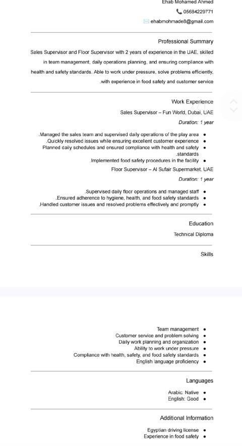I have experience as a showroom supervisor in a supermarket and as a sales supervisor in a children'amusement park. I have two years of experience in the UAE, a Saudi driving license, a new residency permit, and speak English
